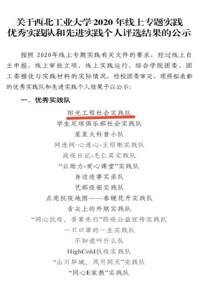 “阳光工程”青年志愿者服务队“互联网+支教”项目团队赴广西融水县和陕西镇巴县开展实地调研和线下支教实践活动。该项目在2020年第十八届“三航杯”大学生课外学术科技作品竞赛获得公益赛道一等奖。在第六届中国国际“互联网+”大学生创新创业大赛中,“阳光工程‘互联网+支教’筑梦未来扶贫项目”荣获陕西省“青年红色筑梦之旅”赛道金奖、校级特等奖等荣誉。