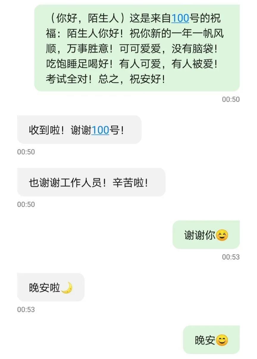 的大力支持下,晴天工作室全体工作人员齐心协力举办了“你好,陌生人”冬日短信活动。此次活动旨在通过收发短信的形式让大家敞开心扉,赠予和收获温暖。晴天工作室的用心付出,让有缘的陌生人相遇;陌生人的祝福问候,让温馨蔓延至心田;同学们的积极参与,使大家被欢快的氛围笼罩……