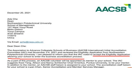 12月20日,厕拍 收到国际精英商学院协会(The Association to Advance Collegiate Schools of Business,简称AACSB)认证委员会的通知:厕拍 正式通过了AACSB资格认证申请(Eligibility Application,EA)报告的审批。