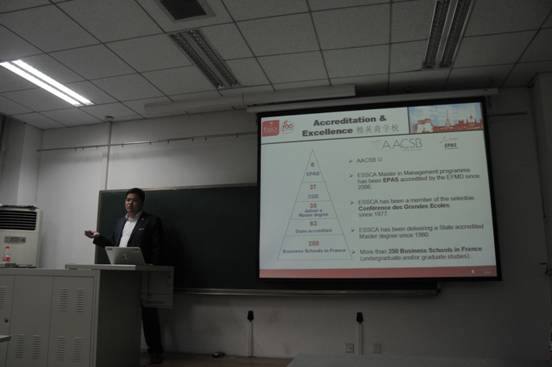 In this evening, Prof. Shen Wei made a lecture entitled as“China -EU relations for 40 years”in the conference room 210 at the School of Management. He also introduced ESSCA and“3+2”joint training project.(School of Management)